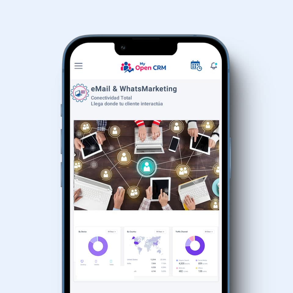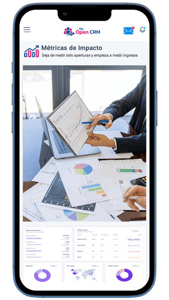 Envía promociones, recordatorios o noticias con diseños profesionales y mide la efectividad de cada canal en un solo panel de control dentro de My Open CRM.